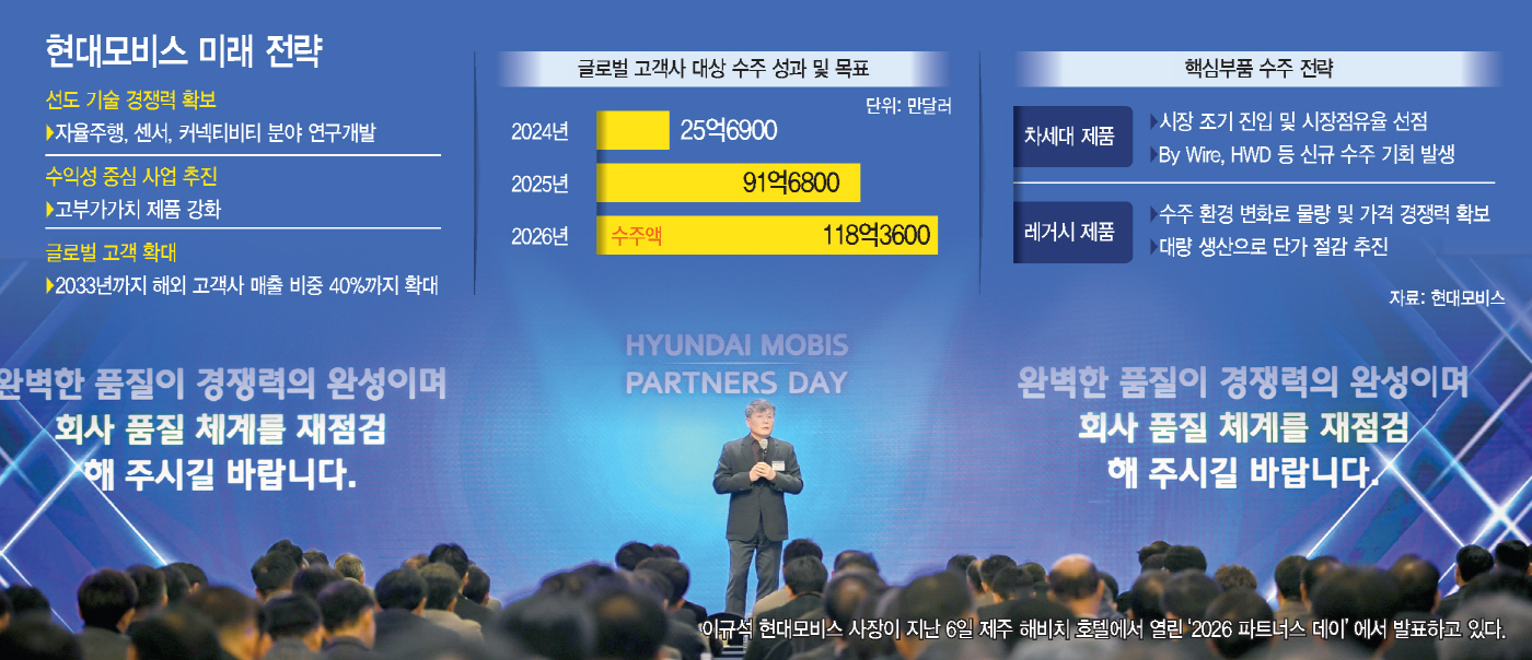 이 같은 변화는 협력사 전략에서도 드러난다. 현대모비스는 지난 6일 제주 해비치 호텔에서 주요 협력사 대표 230여 명을 초청해 '2026 파트너스 데이'를 개최했다. 행사에서는 품질, 안전, 신차 개발, 구매, 동반성장 등 다양한 분야에서 성과를 낸 협력사들이 시상을 받았으며, 회사의 전략 방향과 중점 추진 과제가 공유됐다.
