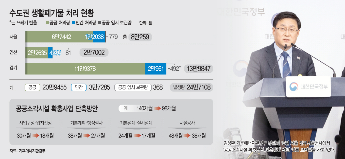 김성환 기후에너지환경부 장관은 12일 정부 서울청사에서 열린 언론 브리핑에서 수도권 공공소각시설 확충 사업을 단축하는 방안을 추진하겠다고 밝혔다. 김 장관은 "기후부와 3개 시도는 공공 소각장 설치 기간을 획기적으로 단축해 생활폐기물이 발생한 지역의 공공시설에서 안정적으로 처리될 수 있도록 행정·재정적 역량을 집중하기로 했다"고 말했다.