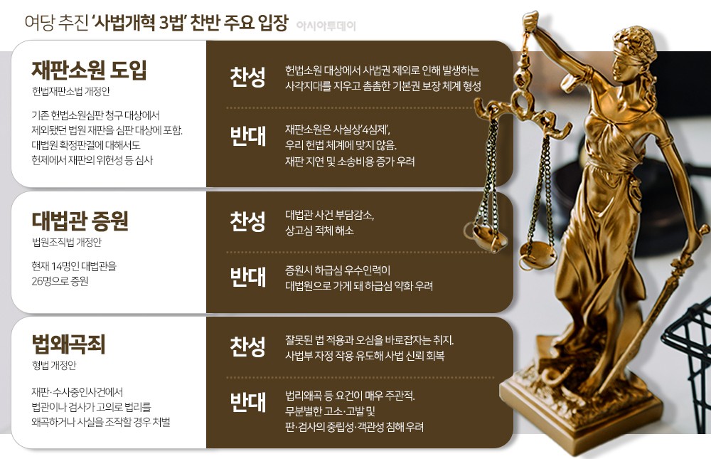사법개혁이 현실로 다가오자 대법원은 전국 법원장들을 긴급 소집해 의견을 듣기로 했다. 대법원은 25일 전국 법원장회의를 연다. 앞서 지난해 12월 열린 전국 법원장회의에서도 법 왜곡죄 등 신설 법안에 대해 위헌 소지가 크다는 목소리가 나온 바 있다. 조희대 대법원장은 지난 23일 "헌법 개정 사항에 해당할 수 있는 중대한 내용이고 국민들에게 직접적으로 피해가 갈 수 있는 문제"라며 공개적으로 반대 입장을 밝혔다.