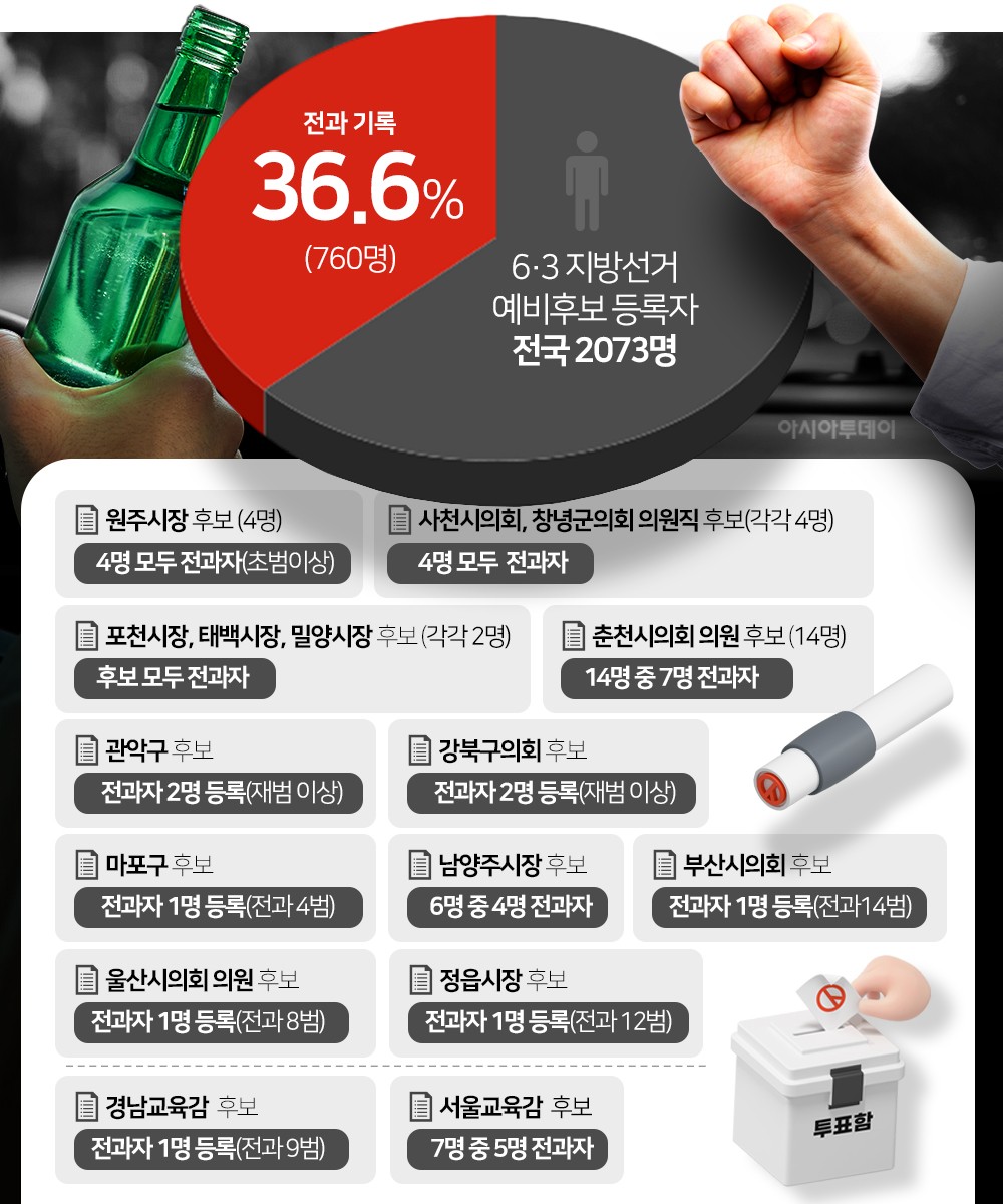 25일 본지가 지선 예비후보로 등록한 전국 2073명에 대한 전과 기록을 전수조사한 결과(24일 기준) 전체 36.6% 규모 760명의 예비후보가 전과 기록을 보유하고 있었다. 예비후보 3명 중 1명 이상이 전과자인 셈이다.