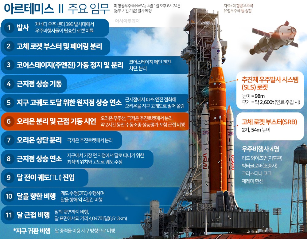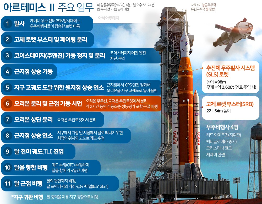 미국 항공우주국(NASA·나사)이 54년 만에 유인 달 탐사를 실시할 준비를 마쳤다. 나사는 미 동부 기준 4월 1일 오후 6시 24분(한국시간 2일 오전 7시 24분) 플로리다주 케이프 커내버럴에 있는 케네디 우주센터에서 승무원 4명을 태운 아르테미스 2호를 탑재한 우주발사시스템(SLS)을 발사할 예정이다.