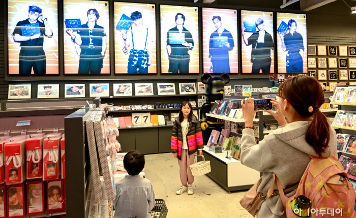 | 방탄소년단(BTS) 컴백 라이브 공연을 닷새 앞둔 지난달 16일 서울 명동 한 케이팝 굿즈 매장을 찾은 외국인 팬들이 BTS 코너에서 기념사진을 찍고 있다. /정재훈 기자 |
