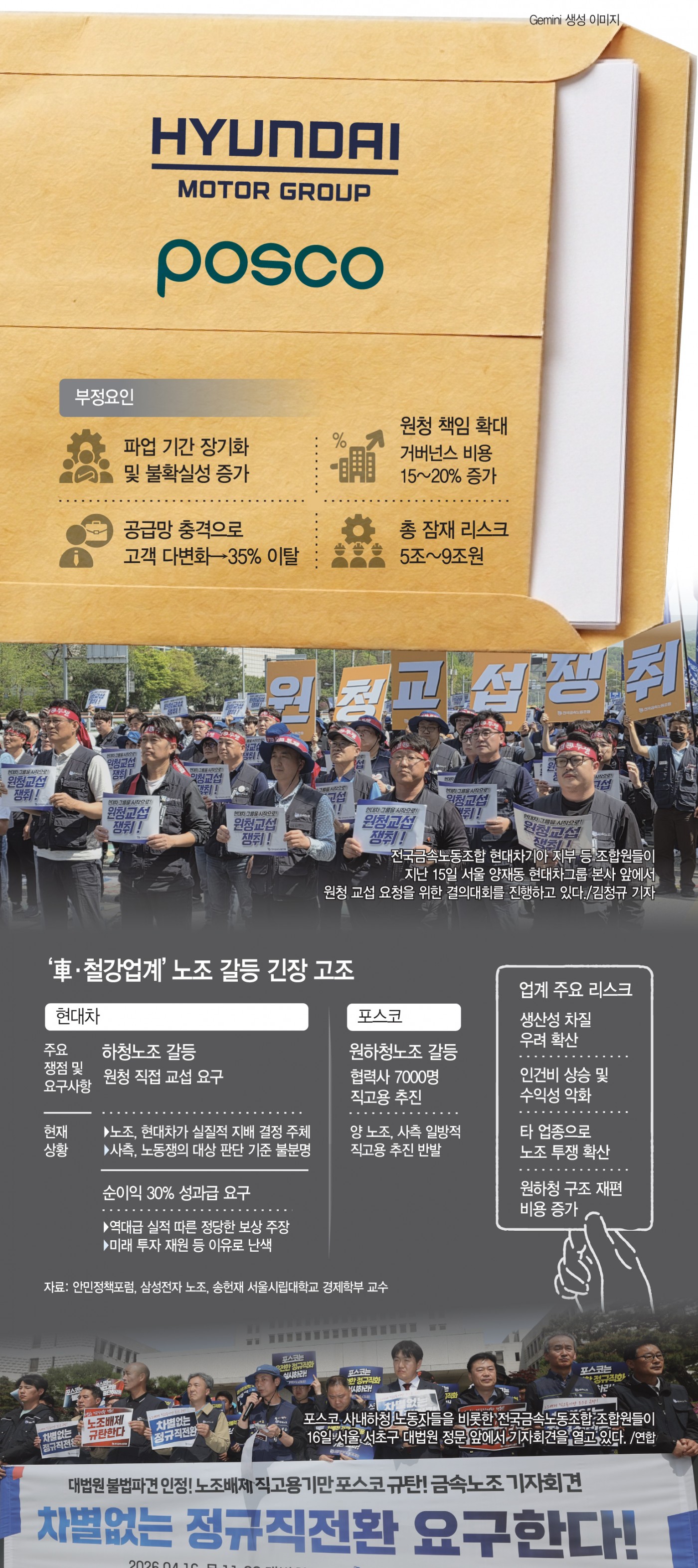 철강업계에서는 포스코가 노란봉투법 시행 이후 최대 노사 현안으로 떠오르고 있다. 협력사 직원 7000여명을 직접 고용하겠다는 대규모 결단을 내놨지만, 정작 원·하청 노조 모두 반발하면서 갈등이 되레 확산하는 분위기다. 업계 안팎에서는 포스코 사례가 향후 제조업 전반 원하청 구조 개편의 가늠자가 될 수 있다는 평가도 나온다.