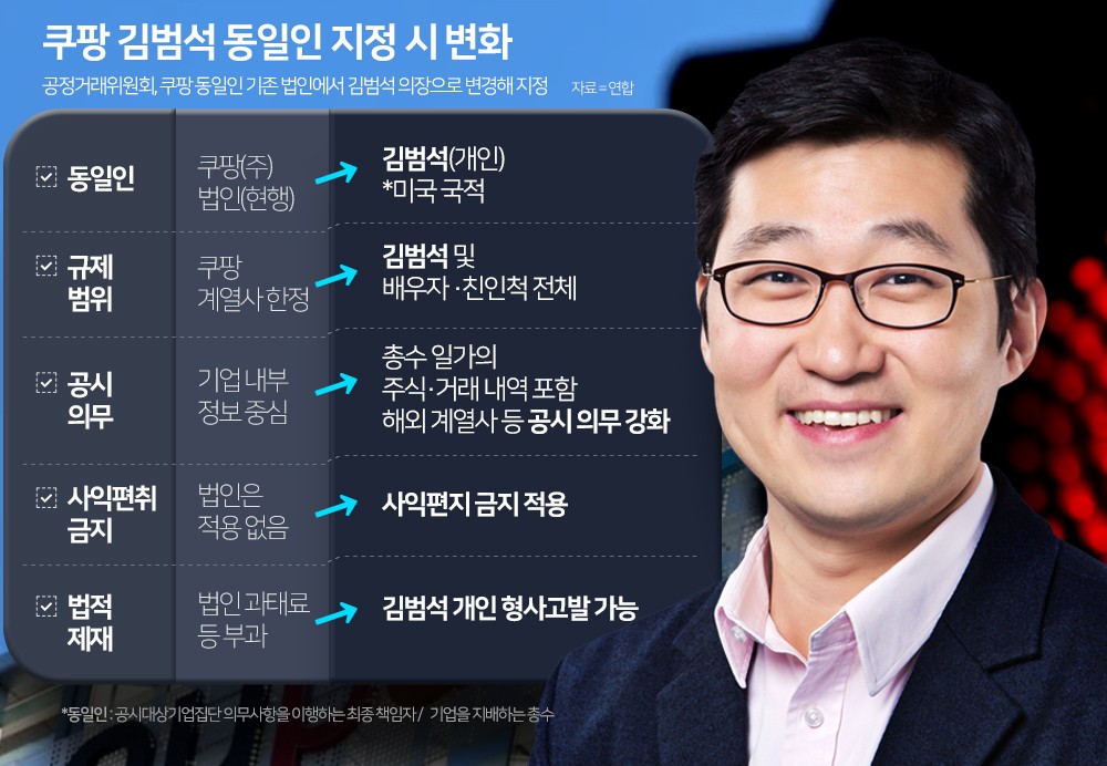 동일인은 원칙적으로 '실질적 지배자'를 기준으로 지정해야 하지만, 쿠팡은 그간 외국계 지배구조를 이유로 예외가 적용돼 형평성 논란이 지속돼 왔다.