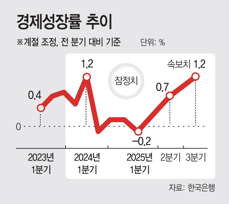 이날 한국은행은 3분기 GDP가 1.2%(전기비·속보치) 증가했다고 발표했다. 이어 "관세 협상 등 불확실성이 있긴 하지만 지난 8월 연간 성장률 0.9%를 제시했을 때보다는 1% 달성 가능성이 높아졌다"고 부연했다. 연간 성장률 전망치가 기존 0.9%에서 1%대로 상향 조정될 가능성이 커졌다는 의미다.