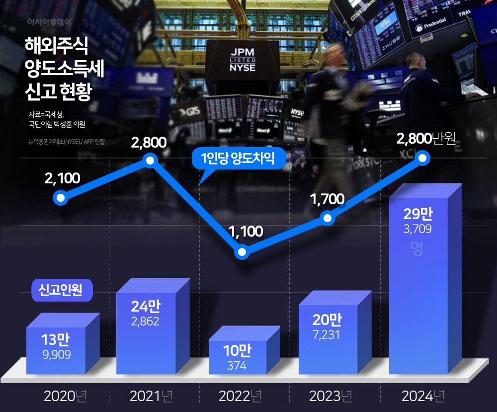 해외주식 투자로 차익을 얻어 양도소득세를 신고한 투자자가2024년 처음으로 50만 명을 넘어섰다.